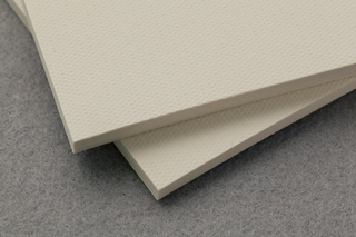 表面は凹凸ライン状の規則的な小さい網模様が特徴的。裏面に加工はなくナチュラルなアイボリー調の色合いの用紙。 ※網模様に沿って白抜けが発生することがある。
