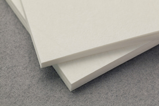 ハマトーンGAスノーホワイト 80kgハンマーで打ちつけたような模様にちなんで名づけられた用紙。厚みがあり片面ずつ凹凸の質感が少し異なる。 |