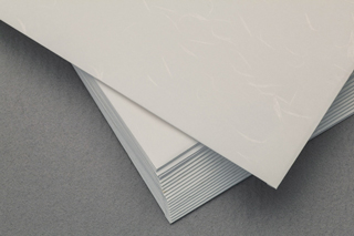 白色に銀の羽模様が入った気品ある和紙のような封筒。表面は滑らかで封筒の内側部分がザラつきのある質感