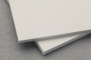 ハマトーンGAスノーホワイト 210kgハンマーで打ちつけたような模様にちなんで名づけられた用紙。厚みがあり片面ずつ凹凸の質感が少し異なる。 |