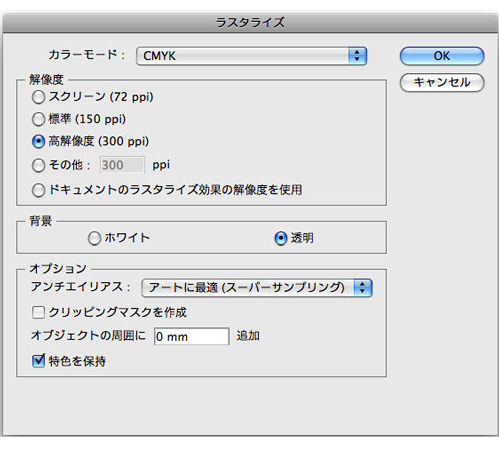 オブジェクト→ラスタライズ(解像度→高解像度300dpi・背景→透明)を指定。