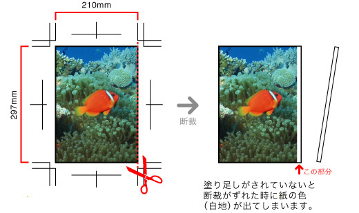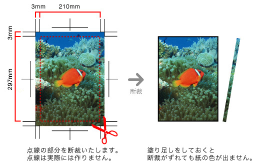 背景の白地を出さないために塗り足しを設定します。左図のように塗り足しが設定されていない場合、点線で断裁すると右図のように白地が出てしまいます。トリムマークは点線で断裁することを示すものです。