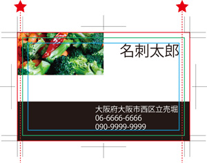 塗り足しの時と同様に、内側に余白を作ります。文字列、ロゴなど中途半端に切れてしまっては困るオブジェクトを断裁のラインよりも3mm以上内側に配置します。余白は断裁のラインが内側にずれた時に対応するものです。