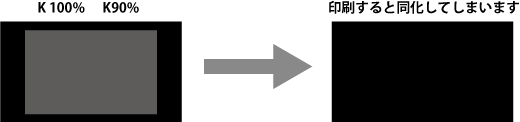 背景K100%のベタ塗りの上にK95%の文字の印字や、5%以下での配色(背景がM2%など)は、モニターの通りに印刷することが出来ません。