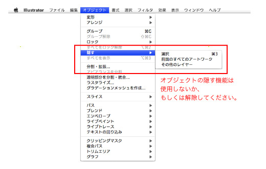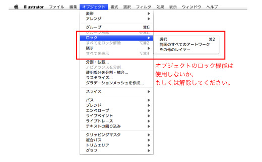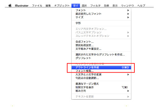 [ レイヤーのロック ][ オブジェクトのロック ][ 隠す機能 ] ( ※参考:隠す、ロック機能について ) が使用されていないのを確認後、全てのオブジェクトを選択した状態で[ 書式 ] → [ アウトラインを作成 ]を行います。