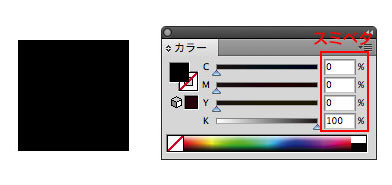 スミベタK100%とリッチブラックC50%M40%Y30%K100%はモニターの見た目ではどちらも黒に見えますが、リッチブラックはK以外の色も指定してありますのでカラー扱いとなります。