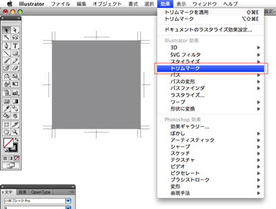 塗り足し、余白共に設定し、断裁位置はトリムマークで指定されています。仕上がりサイズはお申し込みしたサイズに設定してください。(通常はトリムマークを作ってから制作を始めます。)