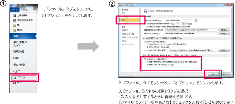 【ファイルにフォントを埋め込む】にチェックを入れて【OK】を選択で完了。